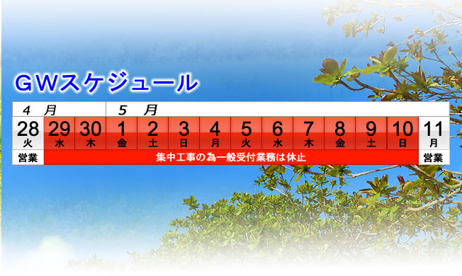 誠に勝手ではございますが、下記期間はGW休暇を利用した集中工事を行う為、一般受付業務は休止とさせて頂きます。